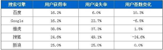 但是,用戶獲得率必須減去用戶流失率才有意義。上述數據中,雅虎搜狐新浪Google的用戶流失率都太高,結果是用戶基數沒增長。