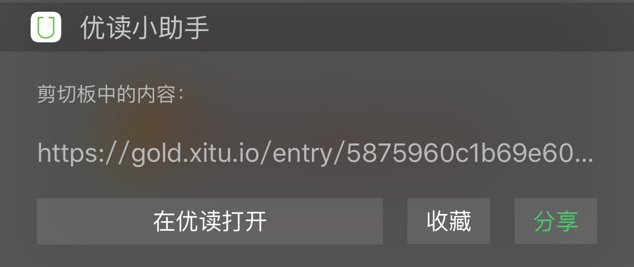 還有一個例子,一款閱讀app,叫作優(yōu)讀。這款產品想要解決的問題是如何從大量信息中篩選出有價值的內容,他們的思路是利用“牛人”推薦和機器算法來完成。他們?yōu)榱朔奖阌脩羧シ窒韮热莸絻?yōu)讀上去,做了很多便捷操作,比如你在任意一個app內閱讀內容,當你想要將這篇文章分享到優(yōu)讀時,只需要復制鏈接,然后下拉通知中心,就可以選擇 收藏或分享文章了。這很便捷。但是完全不適合做小程序。