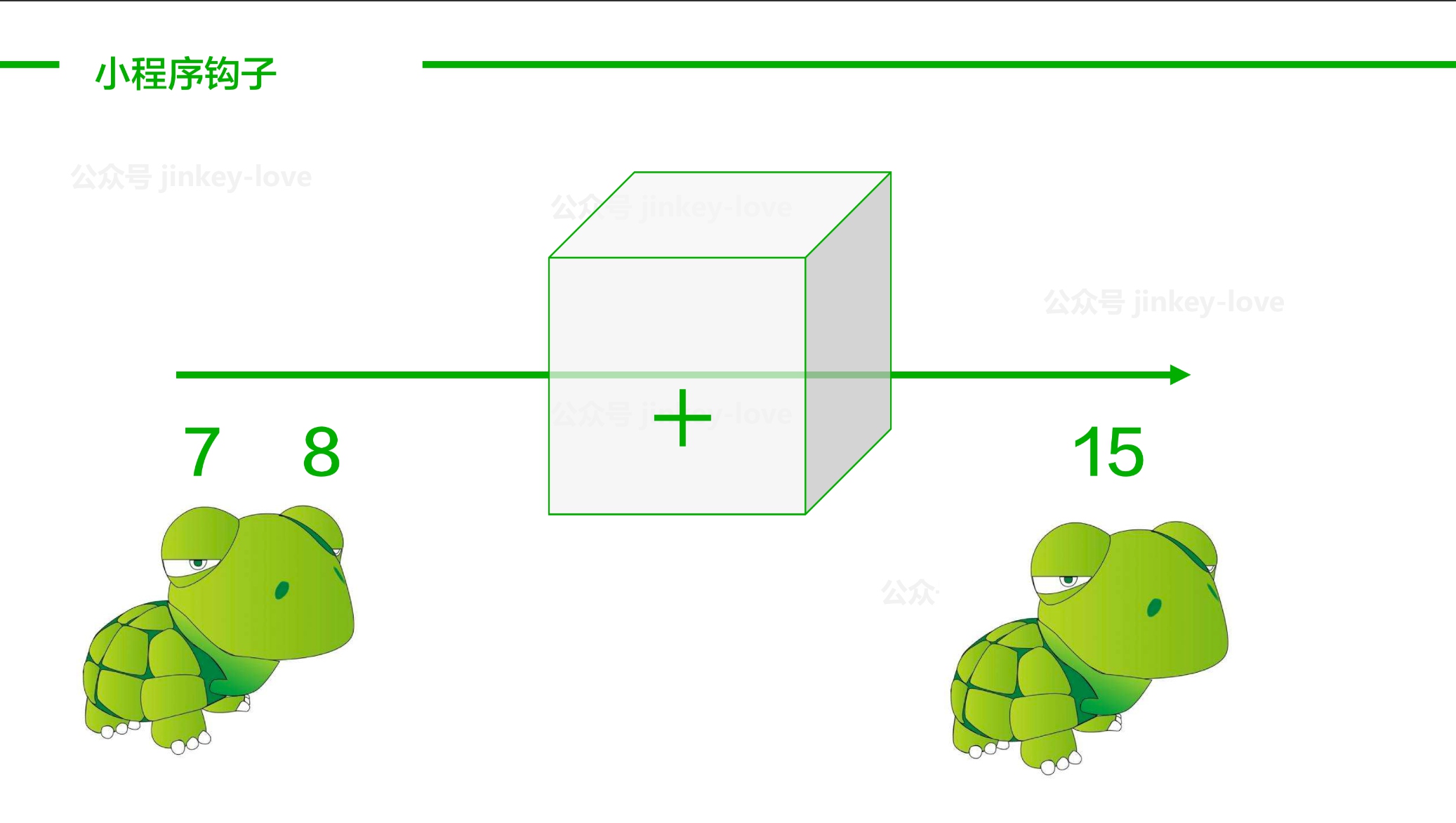一只小烏龜?shù)念^上頂著數(shù)字 7 和 8(額,好像沒什么不對的),他需要走過一個裝著加法運算器的箱子,之后頭上就會變成一個數(shù)字 15。那么這個箱子就稱為一個鉤子函數(shù),如果放在里面的是一個乘法運算器,那么小烏龜?shù)念^上的數(shù)字經過正方體之后就會變成56。
