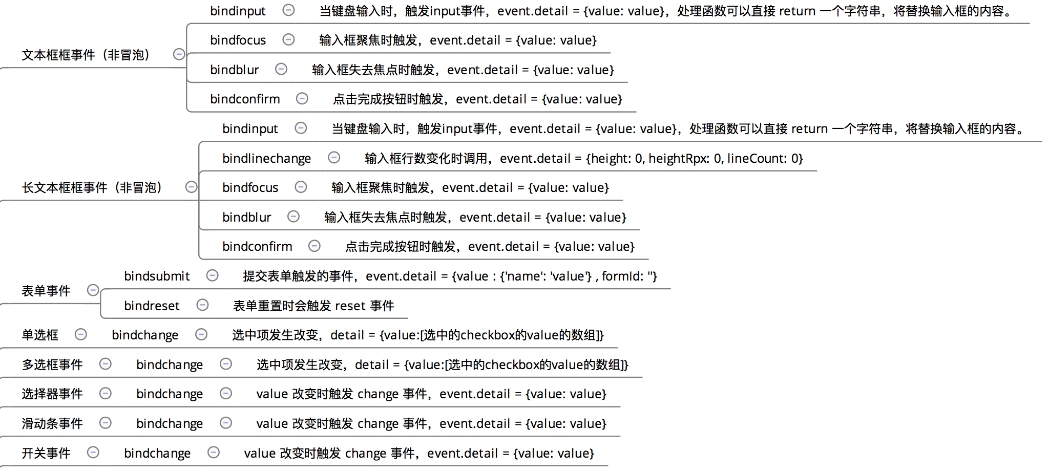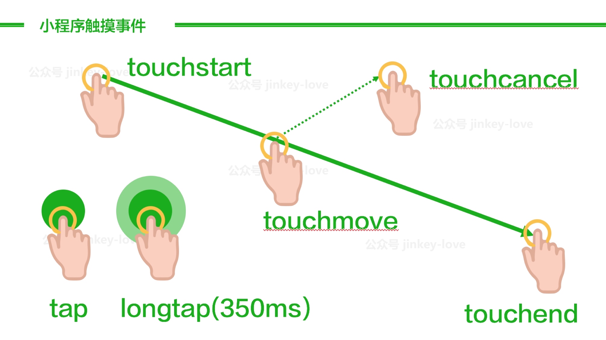 分為點擊、長按、觸摸開始、觸摸移動(比如可用于拖拽排列列表)、觸摸結束、觸摸取消(比如一個看視頻的小程序要求你兩只手都按著手機才能播放,在你看到快高潮的時候,女朋友打電話來,就會觸發(fā) touchcancel 事件)