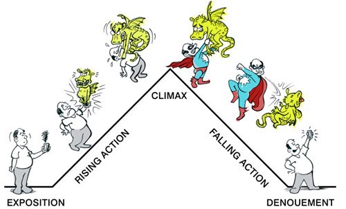 ·情節。許多設計師在進行設計的時候,會跳過上下文環境、使用場景和基礎的設定與流程,直接進入細節設計,這樣做是很容易出現錯漏的。故事應該擁有基礎架構,設定和劇情的,有起因,經過,結果。所以,在故事板當中,應該給你所設定的角色一個目標,有東西觸發事件開始,并且通過執行,完成任務,或者階段性結束任務,為角色留下新的問題。我們可以使用 Freytag 的金字塔來描述情節: