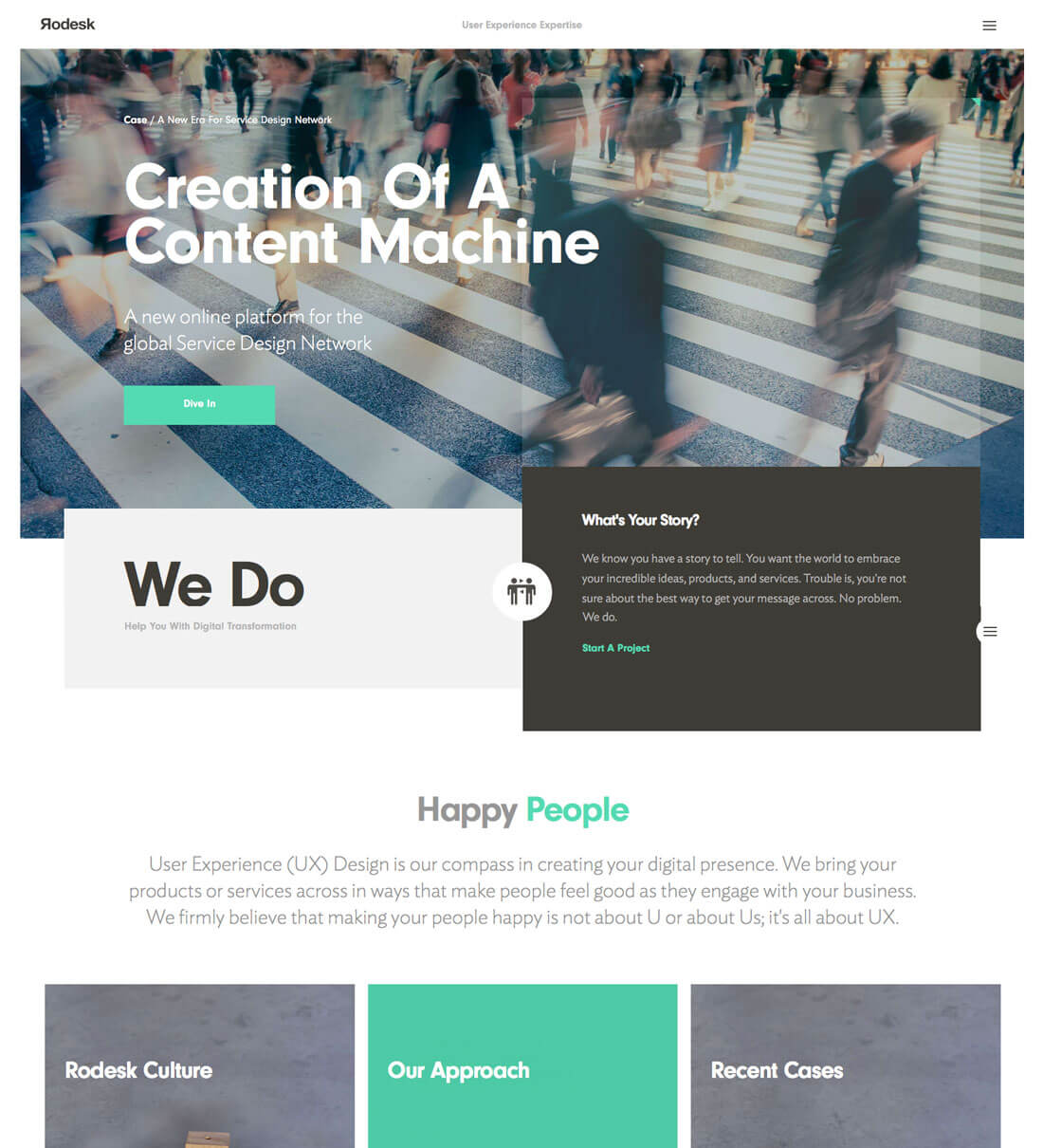 單頁式(也稱為廣告頁)設計這幾年比較流行,它很適合于展現極簡的內容,或者專注展示一個主題。當網站的主題比較明確,內容也比較單一固定的時候,無需復雜的布局來實現,單頁單列式的布局足以應付搞定一切。導航、主要內容區域(文字+圖片為主)、頁腳。采用這種布局模式的時,非常考驗設計師設計留白和排版能力。版塊之間的連接設計是需要設計師反復推敲的,如果空間控制不合理會給用戶一種混亂的感覺,如果過于緊密則會產生局促感。和單頁設計結合最緊密的應該是動效設計和視差滾動,他們可以讓單頁式設計更加生動有趣,淡化單調的設計,賦予頁面更強的生命力。