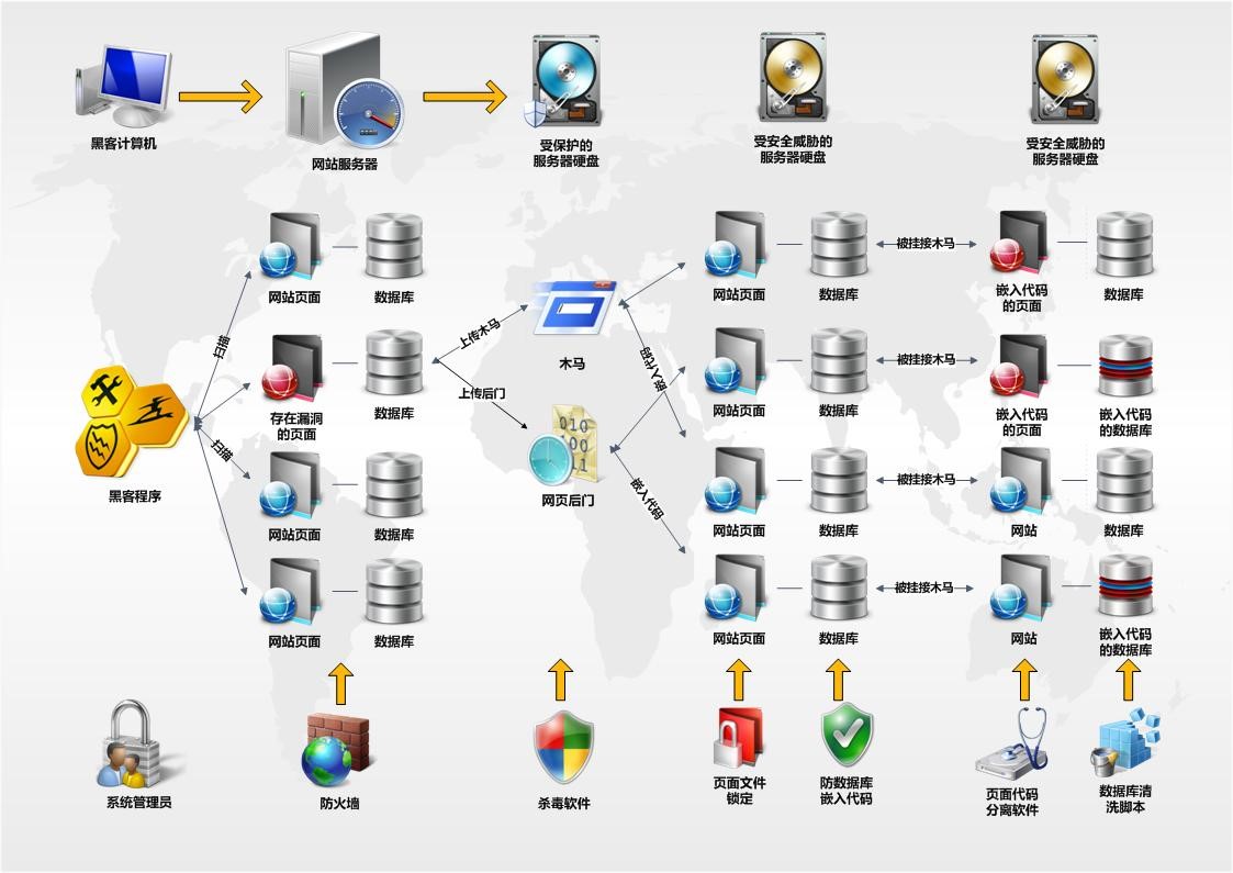 頁面代碼分離軟件批量清除網站頁面中的惡意代碼;數據庫清洗腳本清理數據庫中的惡意代碼。