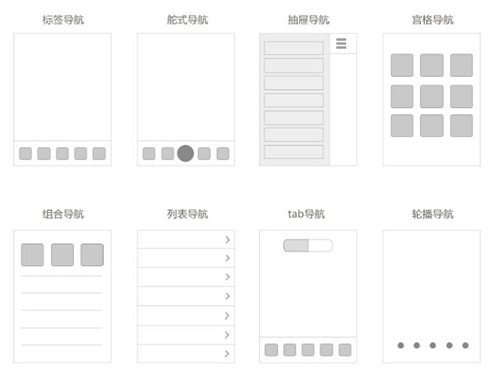導航是 APP 產品的神經中樞,同時,也是各個功能的入口。其幫助用戶找到想要瀏覽的頁面,想要查找的信息。同時,也為用戶指明當下所在虛擬位置。因為虛擬的架構沒有現實世界中那么明顯的方向感,導航指向不明確很容易讓用戶迷失方向,成功的導航可以自我解釋,即讓用戶明白APP的信息框架。下圖是常見的八種導航: