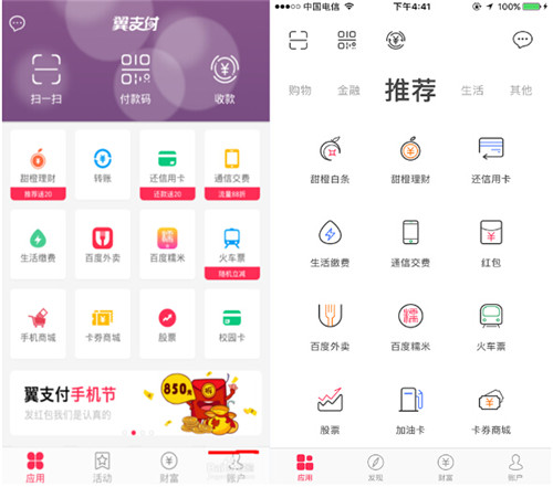 上圖是翼支付在近期一次重大改版中所做的改變:為標簽做“廣度”。這樣的改變一定程度的減輕了用戶在使用時的難找到自己需要的功能的問題,但是還有一些問題: