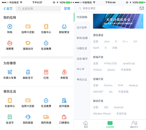 下圖左邊是支付寶10版后應用的界面,我們可以發現幾個特點: