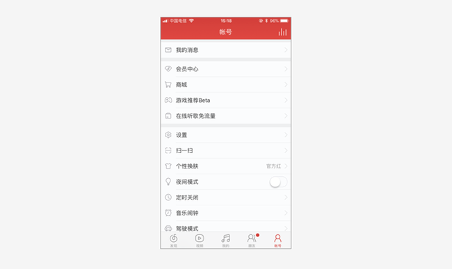 以列表的形式呈現(xiàn)功能,適用于大量的功能的展現(xiàn),通常作為次級導(dǎo)航,如網(wǎng)易云音樂的賬號頁。
