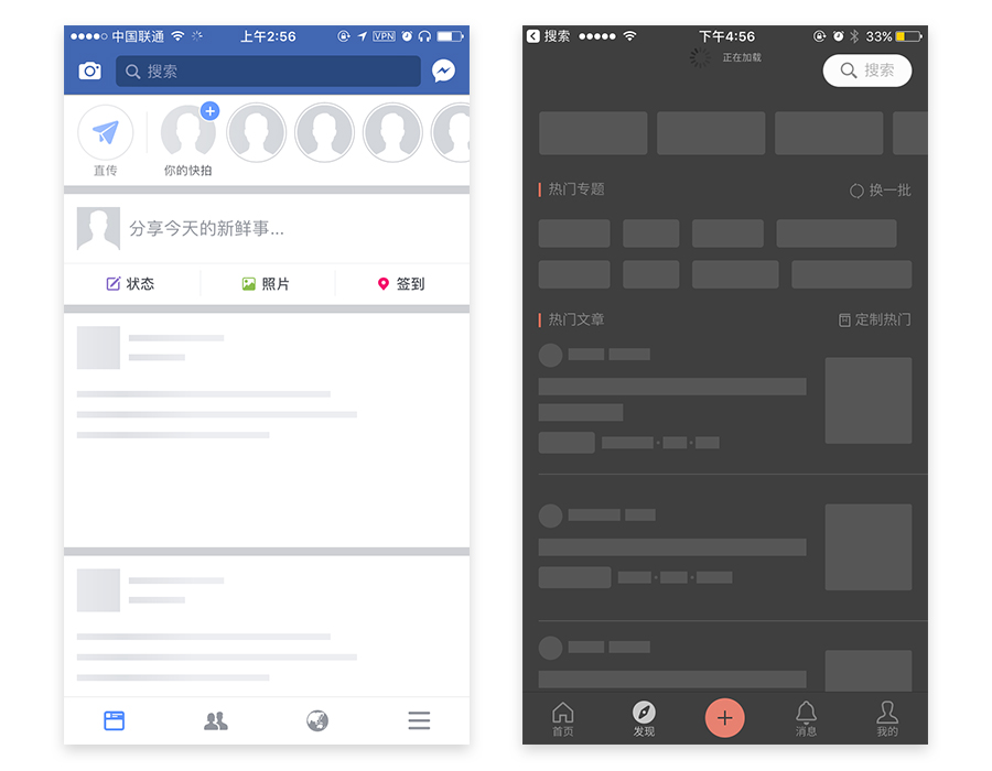 這種形式一般用于內容框架固定的頁面,如果頁面可能會出現空數據的情況也不宜使用。像下圖的Facebook首頁,簡書的首頁和發現頁,頁面結構固定,且內容不會為空(除非網絡異常導致加載失敗),就很適合用Skeleton Screen的加載形式。配合前面講的優先加載的方式,效果會更佳。