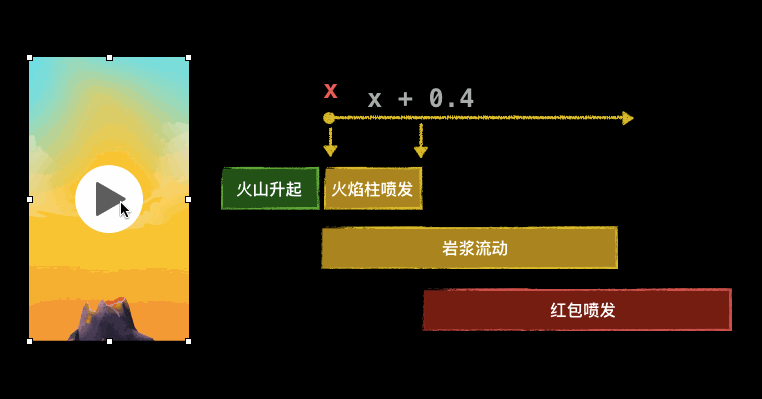 同樣拿上圖來說,如果我給火山升起通過playAt()來得到起始時間,并且函數能拿到其停止時間,并且在其停止的這個時候通知其他動畫什么時候開始播放。這樣我們控制動畫會變得輕松的多。哪怕是我們需要改變其中某一個或某兩個的時間,也可以很好的自動獲取。