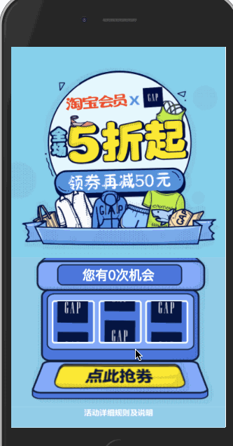 這是別人家的產品,也是巨人的肩膀。其實在Lottie和Bodymovin還沒有開源出來的時候,我們團隊也有一個類似的產品,AFT(Animation Flow Tools)。AFT沒有開源,我不能聊得太多,簡單的說,AFT具有自己的渲染引擎、也可以借用別人的渲染引擎,比如Canvas、Weex之類。但其主要功能和特點是用來管理動畫,擴展動畫。而且AFT也具有類似Lottie的特性,只不過我們的Player層是自己寫的。下面的示例就是使用AFT通過AE轉出來的一個動效,并且在實際項目中運用的: