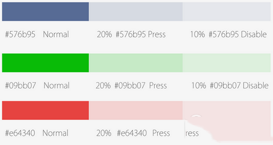 藍色為鏈接用色,綠色為完成字樣色,紅色為出錯用色Press與Disable狀態分別降低透明度為20%與10%;