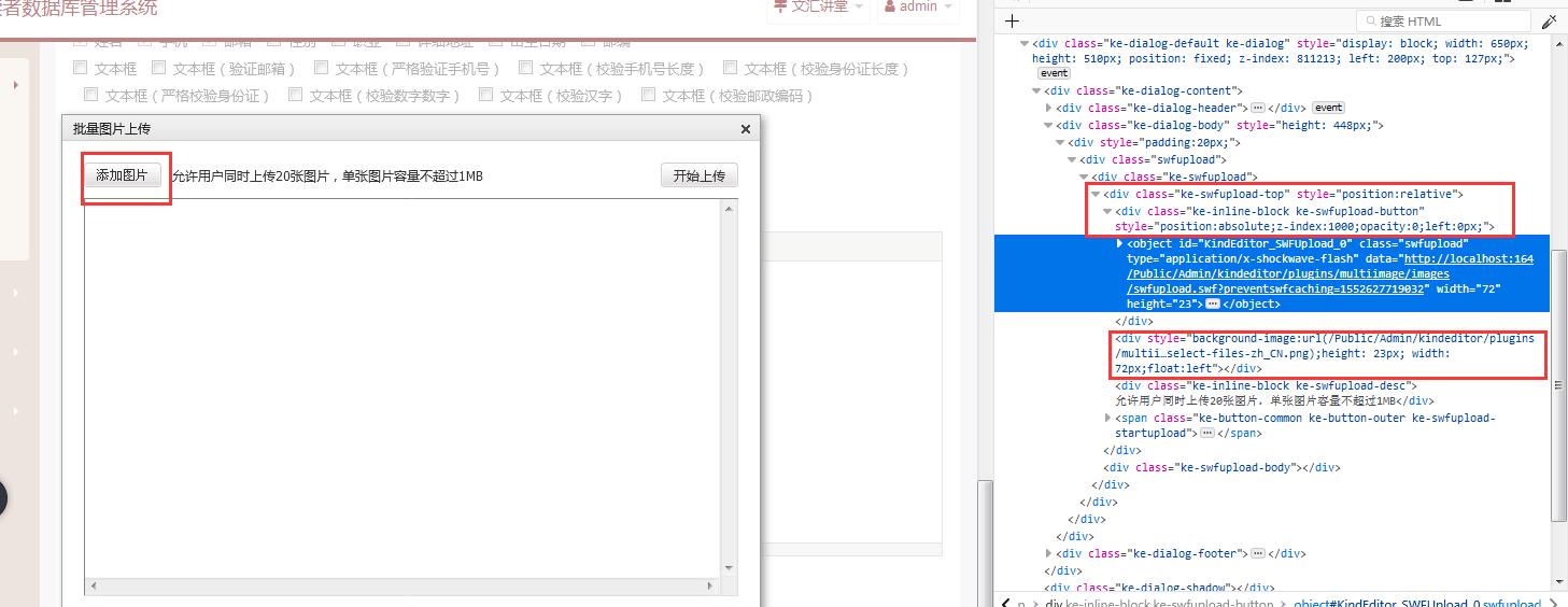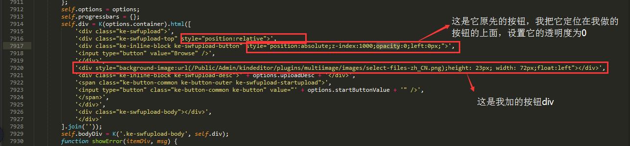 在他的kindeditor-all.js文件中,對上傳圖片的objcet標簽的父標簽的div設置了絕對定位,又重新做了一個按鈕的div,把object標簽的父標簽div定位到我新做的按鈕div上,設置object標簽的父標簽div的透明度opacity:0,如下圖