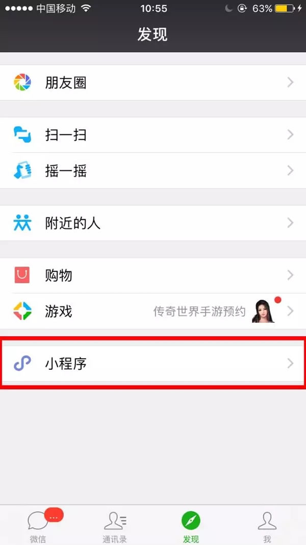 5、退出這個頁面,回到微信,點開你的微信第三頁面 “發現”,就能看到你的小程序啦!
