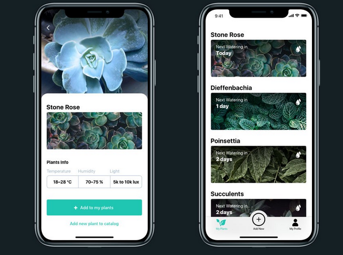 3、進入每個植物對應的子界面之后,底部會有一個功能強大但足夠件的標簽欄,它包括有三個最基本的交互區域:“我的植物”(My Plants)會打開澆水追蹤的目錄,“新添加”(Add New)按鈕則讓用戶可以添加新的植物,而“我的資料”(My Profile)則讓用戶可以查看相應的歷史資料和統計數據。