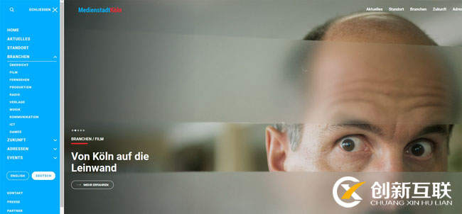 德國網站Medien?stadt.koeln對垂直導航有不同的看法。他們的導航始終隱藏在漢堡包菜單之后,但仍然跨越屏幕的整個高度。