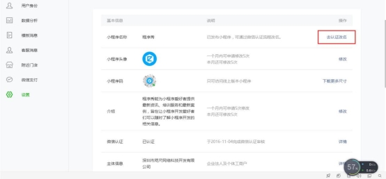 首先登錄小程序后臺,點擊設置,然后點擊小程序名稱右側,“去改名”,接下來進行微信認證流程改名即可。