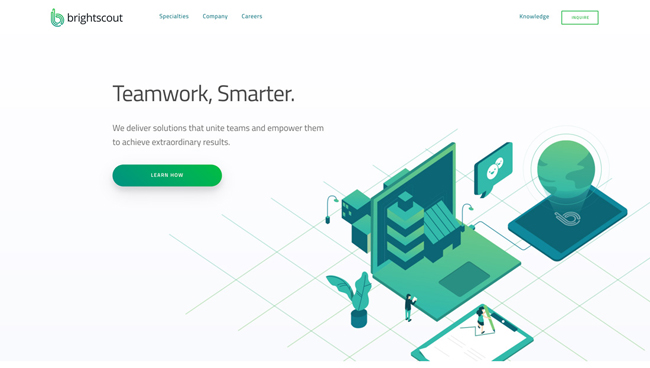 Brightscout該網站的設計第一個屏幕使用了一個微妙而有趣的對角布局。 圖片和文字描述分布在整個網站上。 這種拼湊布局給人一種開放的感覺。 在滾動過程中,放大運動效果會使人無法停止滾動。 該頁面最終被引導至CTA按鈕,該功能是顯而易見的。
