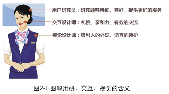好的用戶體驗,就如同彬彬有禮的服務人員,不但能馬上解決用戶的問題,其優美的談吐、機智的反應,也會給用戶一次非常美妙的體驗。如果把產品比做圖2-1左側的這個服務人員,那么這3個職位的作用正如圖中所描述的那樣。