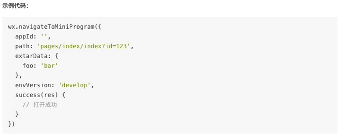 如果有需要,開發者可以詳細參考《小程序開發文檔》。需要指明的是,在開發者工具上調用此 API 并不會真實的跳轉到另外的小程序,但是開發者工具會校驗本次調用跳轉是否成功。